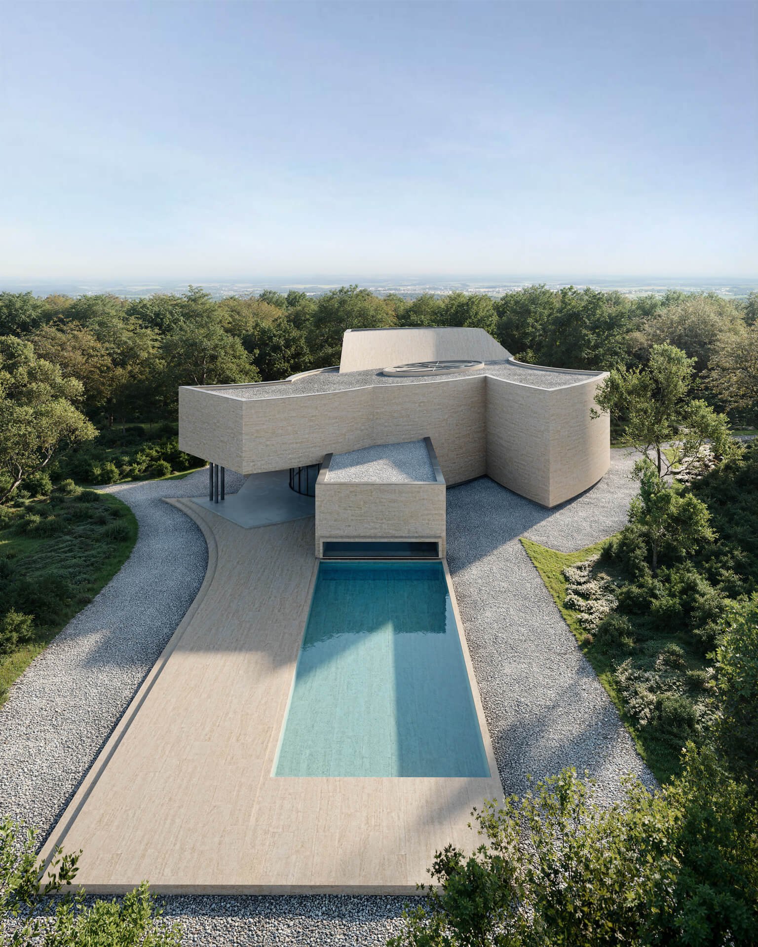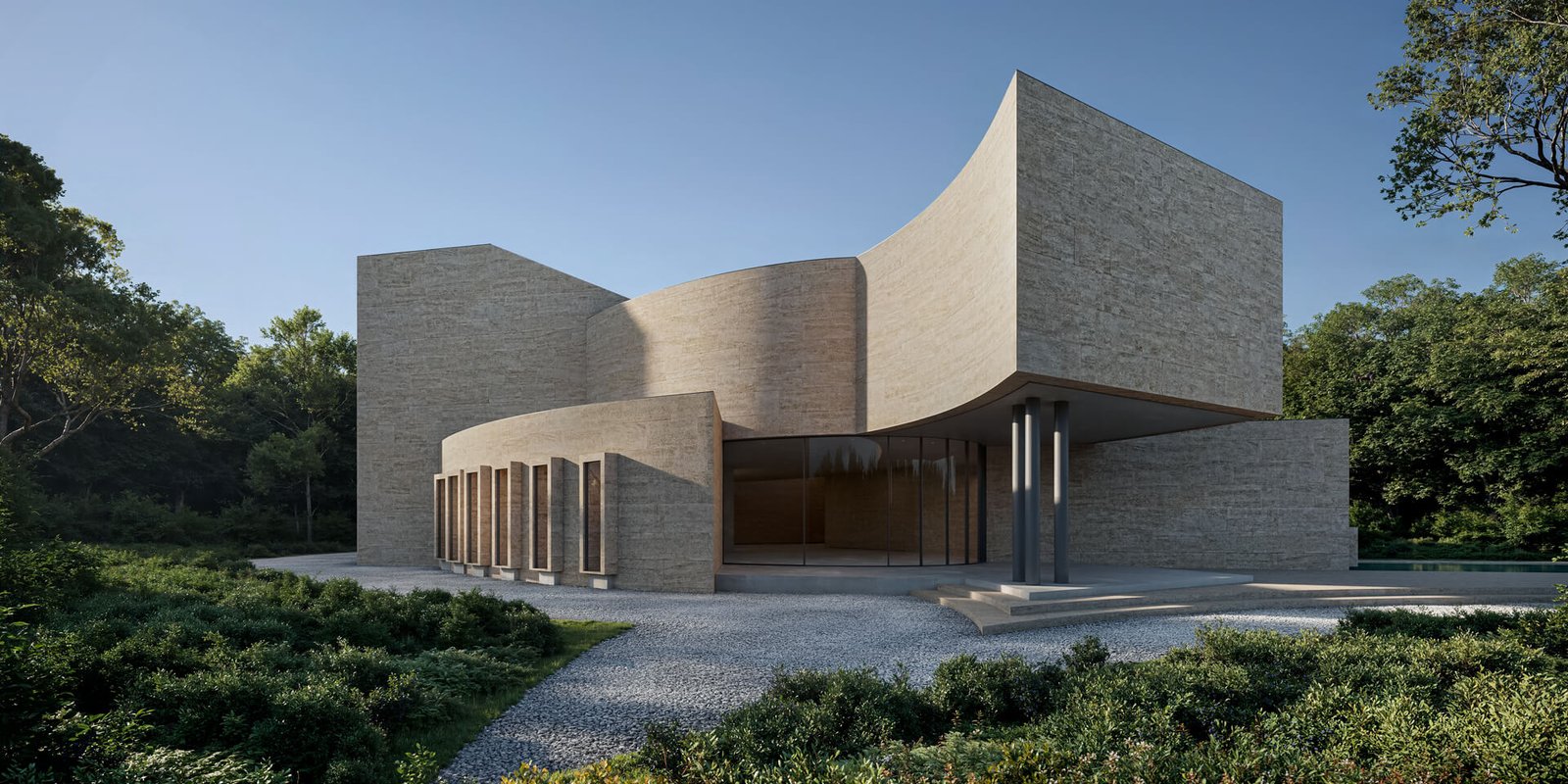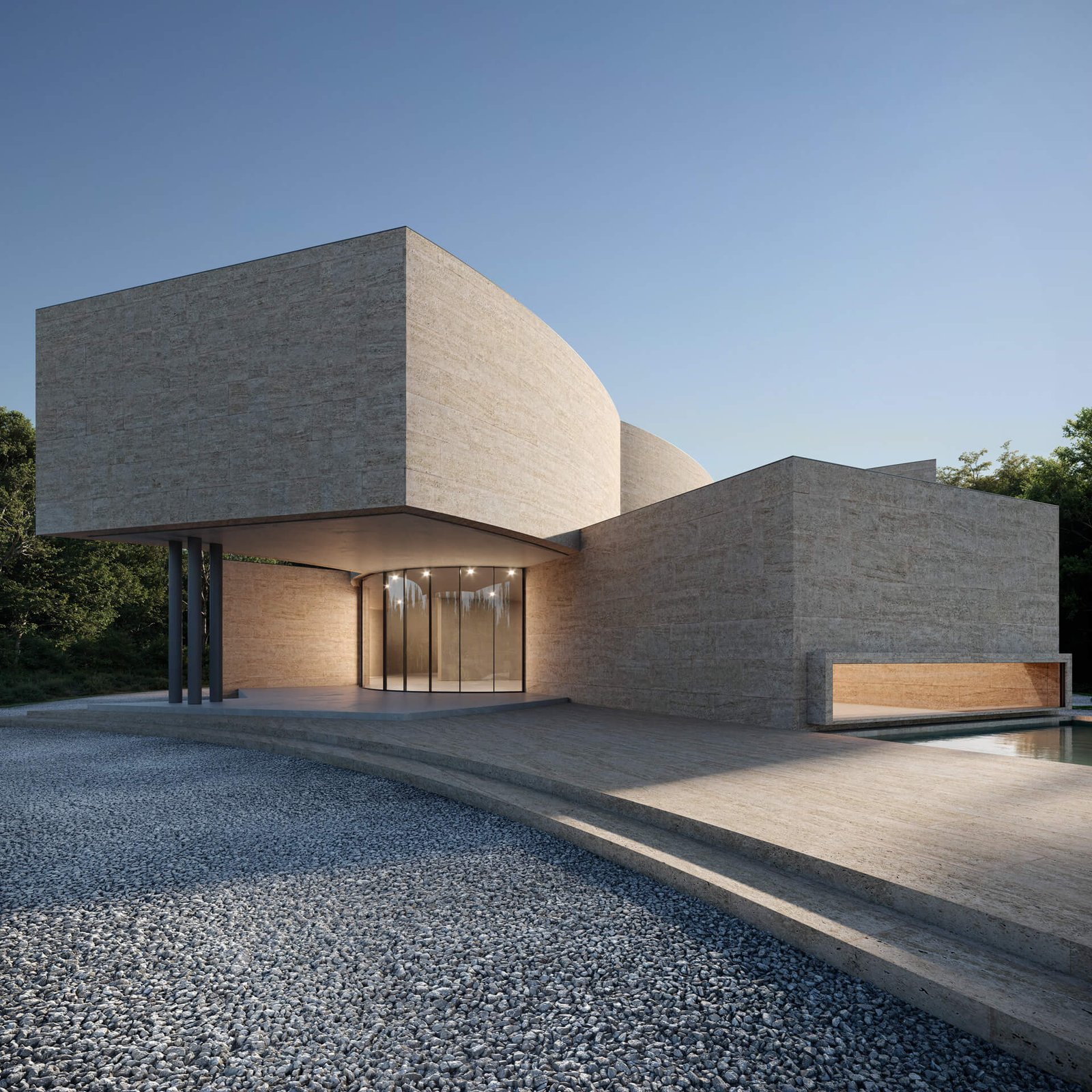 This museum project redefines the relationship between art, architecture, and landscape. The design is characterised by monolithic geometric forms in textured stone, creating a bold yet timeless presence. Curved and linear volumes interplay to frame light and shadow, while large expanses of glazing invite natural light deep into the exhibition spaces. The solid