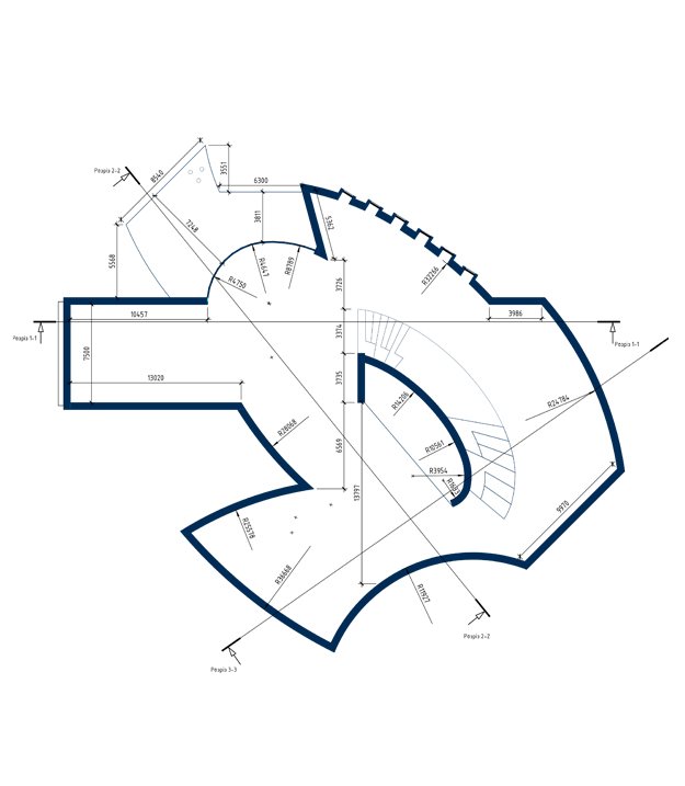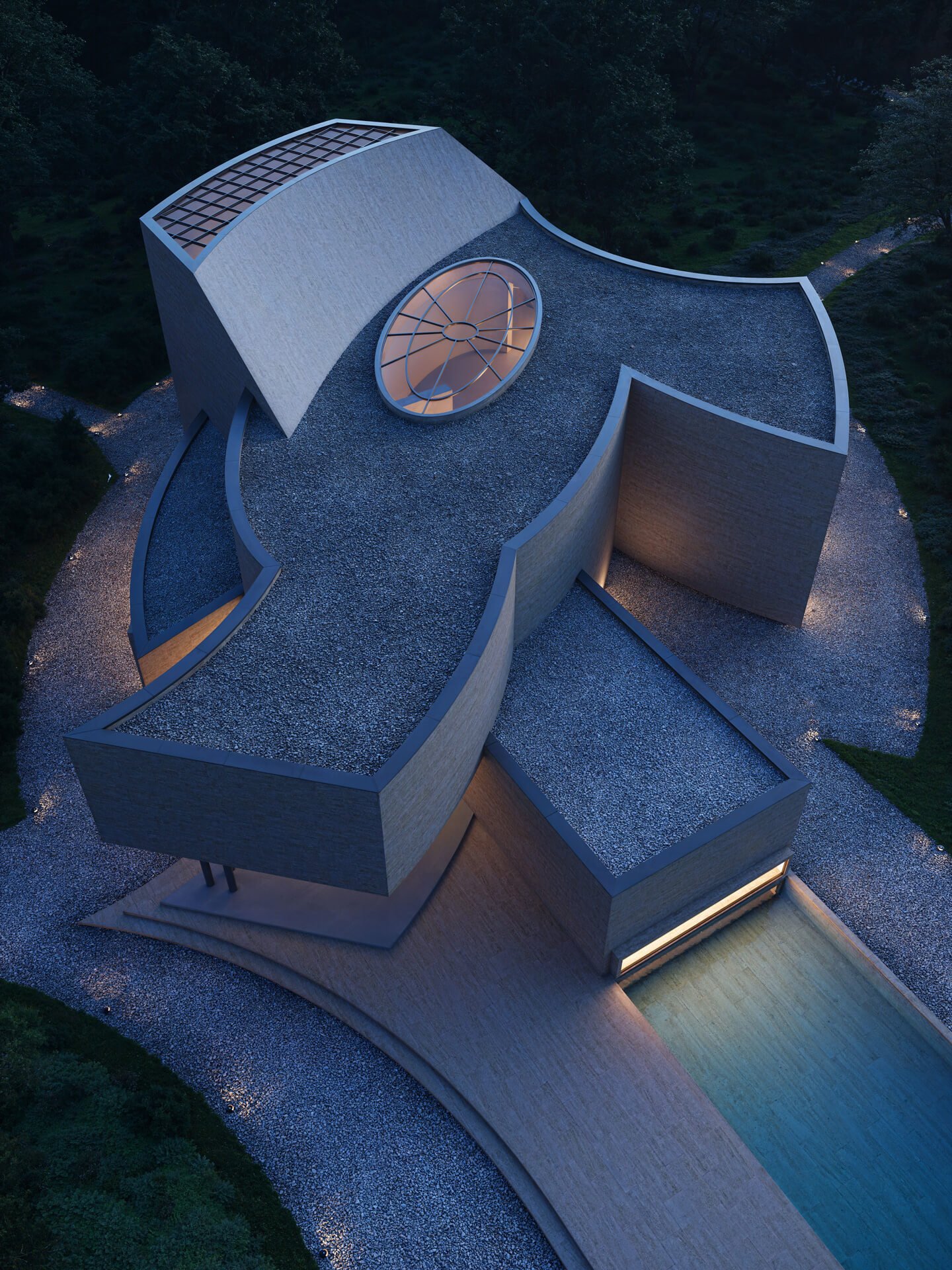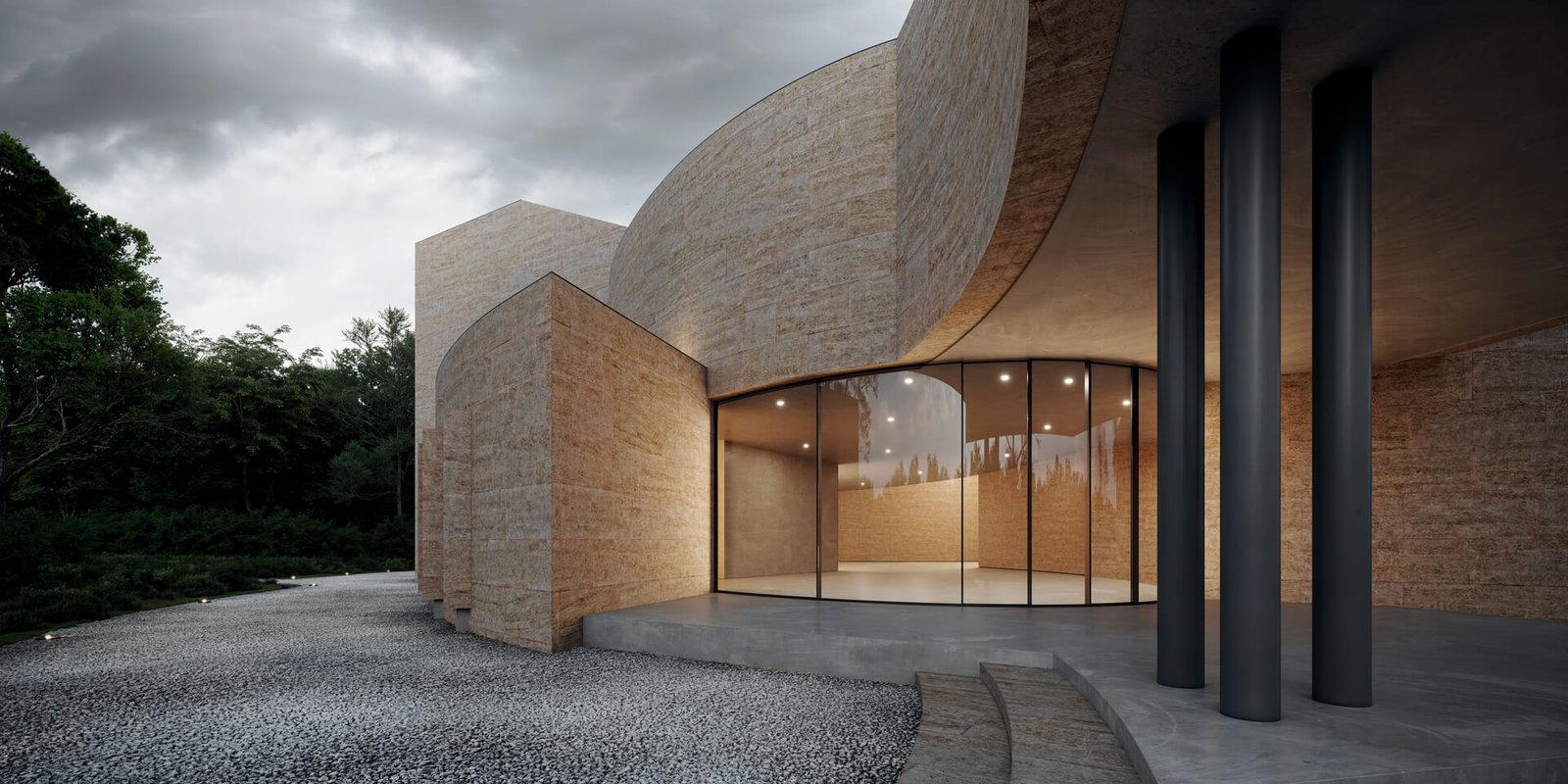 This museum project redefines the relationship between art, architecture, and landscape. The design is characterised by monolithic geometric forms in textured stone, creating a bold yet timeless presence. Curved and linear volumes interplay to frame light and shadow, while large expanses of glazing invite natural light deep into the exhibition spaces. The solid